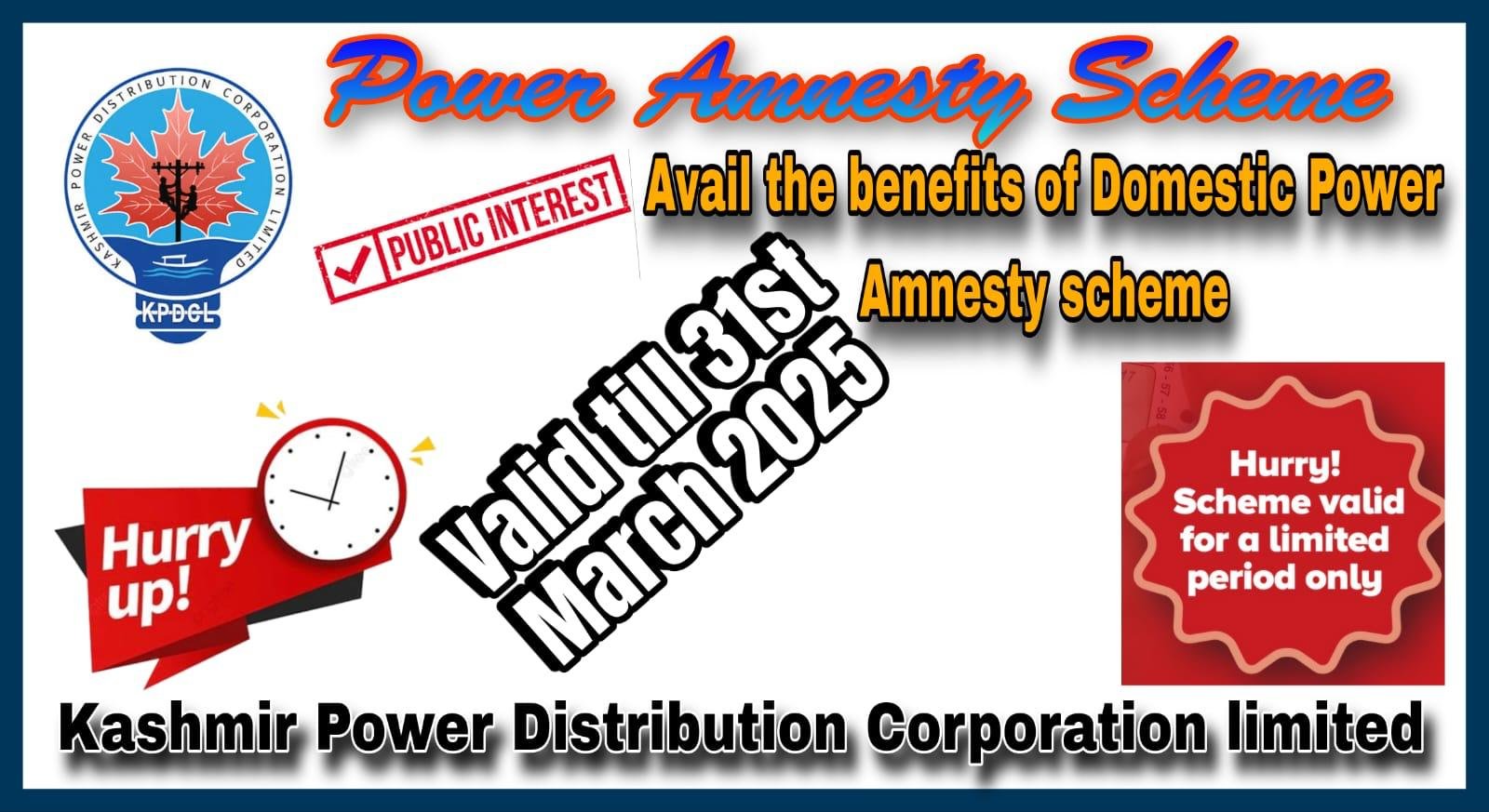 The Kashmir Power Distribution Corporation Limited (KPDCL) today made a final call to its domestic consumers, urging them to come forward and claim a waiver on late payment surcharge under the Government’s Power Amnesty Scheme. The scheme, which has been running for several months, is set to end on March 31, 2025, and there will be no further extension after this deadline.